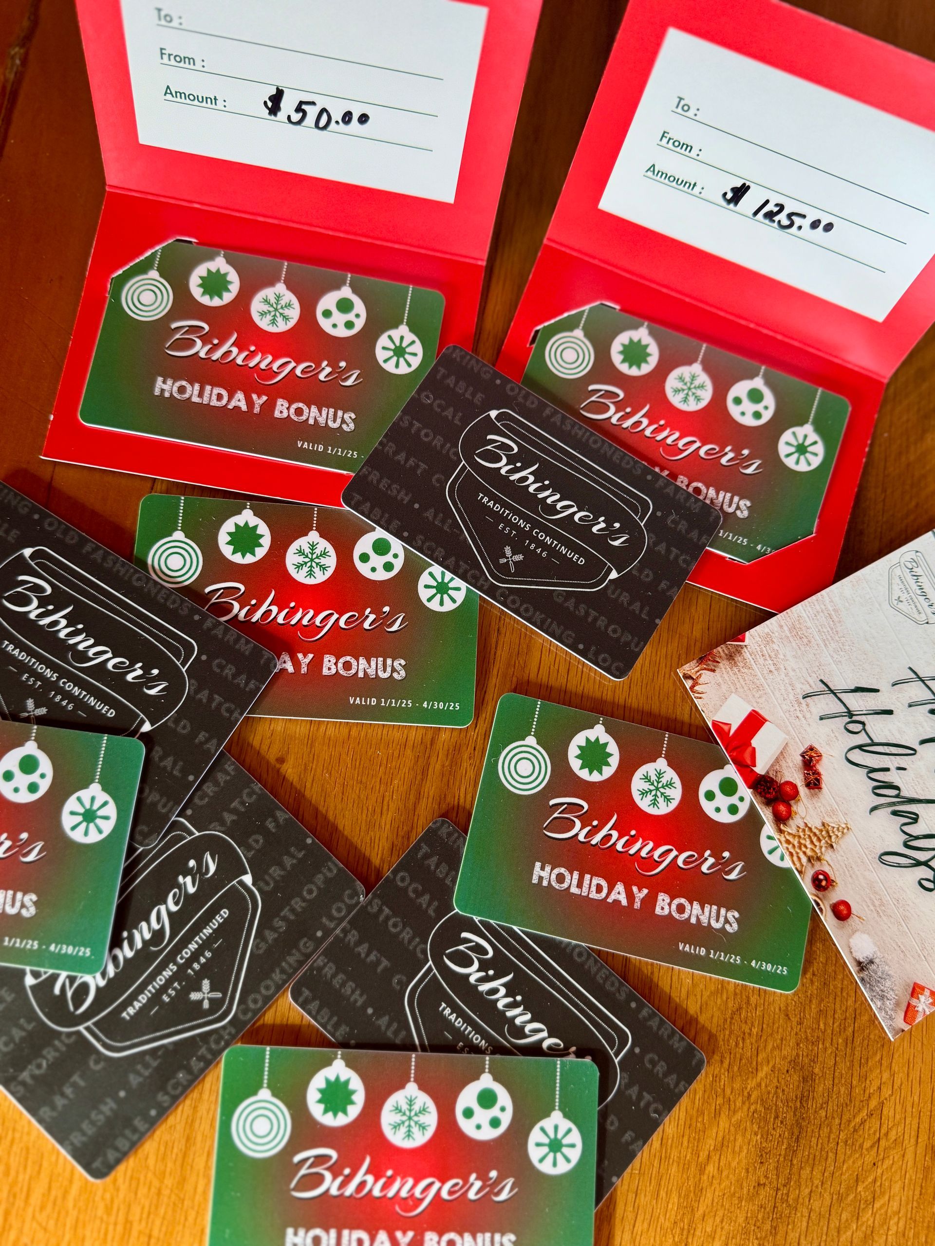 E-gift cards can be purchased online and are also eligible for the bonus card. Please note that bonus cards must be picked up in person at Bibinger's. Within 24 hours of your purchase, a separate email will be sent to confirm the contact details for the person who will be picking up your bonus card from Bibinger's.